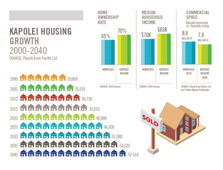 With Kapolei’s resident population expected to reach nearly 165,000 in 2035, to keep pace, housing is expected to grow from 30,000 today to a little over 56,000 units.